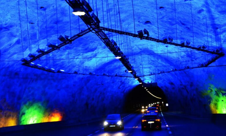 Συναντήσαμε πολλά τούνελ στη διαδρομή μας. Η Νορβηγία διαθέτει περισσότερα από 34 τούνελ, αρκετά από αυτά υποθαλάσσια, σε κάποια φαίνεται η πέτρα σαν μόλις να τα είχαν σκάψει. Σε άλλα εντυπωσιάζουν οι κυκλικοί κόμβοι με σήμανση σαν να οδηγείς σε υπόγειο αυτοκινητόδρομο. Το πιο συναρπαστικό όμως είναι οι μπλε θάλαμοι που σε μεταφέρουν σε άλλη διάσταση.